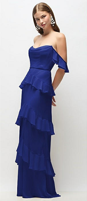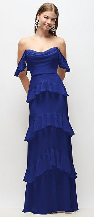 Off-the-Shoulder Cowl Chiffon Tiered Ruffle Maxi Dress with Convertible Ruffle Straps in cobalt blue