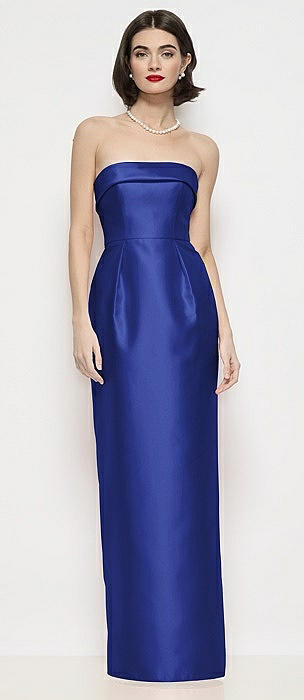 Strapless Pleated U-Wire Satin Column Maxi Dress in cobalt blue