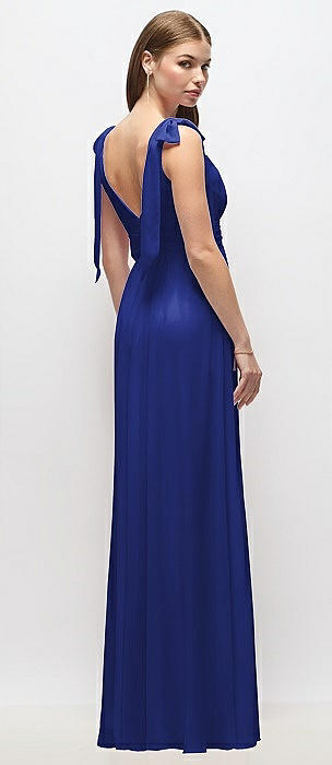 Plunge Neckline Bow Shoulder Empire Waist Chiffon Maxi Dress in cobalt blue