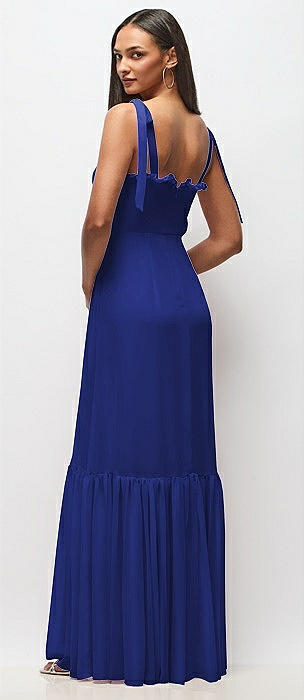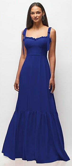 Tie-Shoulder Bustier Bodice Ruffle-Hem Maxi Dress in cobalt blue
