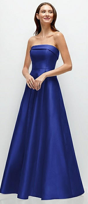 Strapless Satin Drop Waist Gown with Full Skirt in cobalt blue