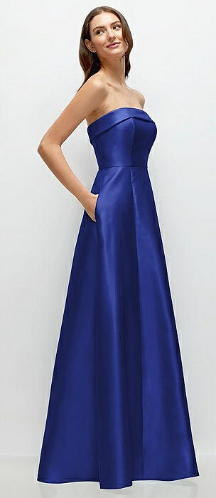 Strapless Bias Cuff Bodice Satin Gown with Pockets in cobalt blue