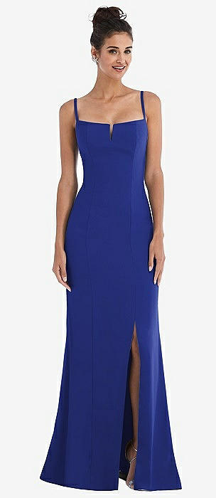 Notch Crepe Trumpet Gown with Front Slit in cobalt blue