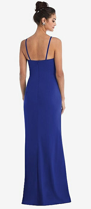 Cowl-Neck Wide Strap Crepe Trumpet Gown with Front Slit in cobalt blue