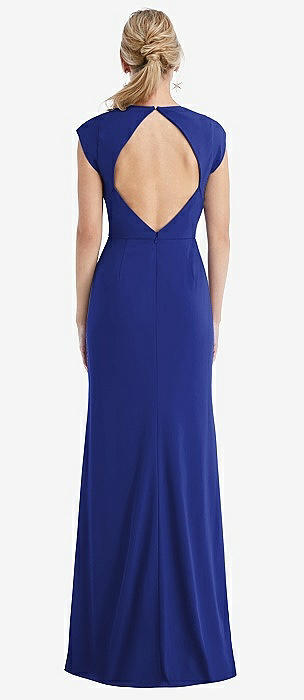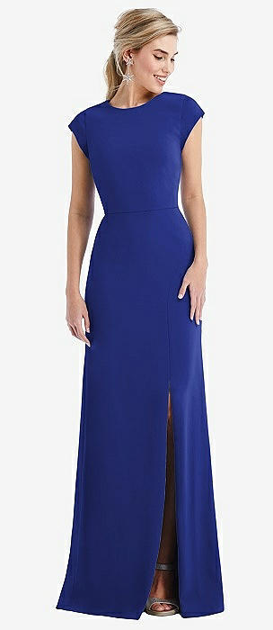 Cap Sleeve Open-Back Trumpet Gown with Front Slit in cobalt blue