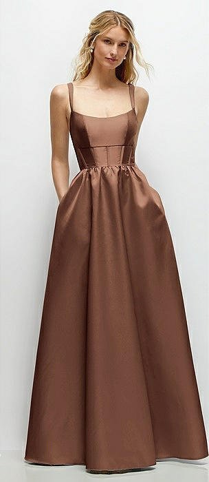 Scoop Neck Drop Basque Skirt Satin Maxi Dress with Pockets in cognac