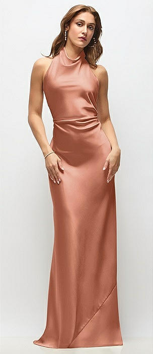 Cowl Halter Open-Back Satin Maxi Dress in copper penny