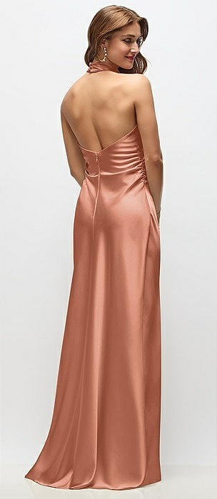 High-Neck Halter Stretch Satin Maxi Dress with Bias A-line Skirt in copper penny