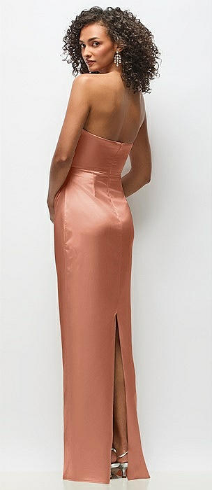 Strapless Draped Bodice Stretch Satin Column Maxi Dress in copper penny