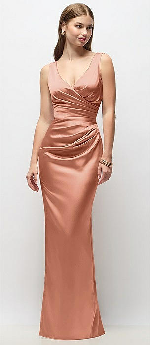 Sleeveless Draped Wrap Bodice Stretch Satin Column Maxi Dress in copper penny
