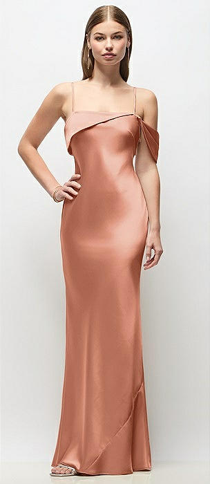 Asymmetrical Cuff Neck Stretch Satin Bias Maxi Dress with Adjustable Spaghetti Straps in copper penny