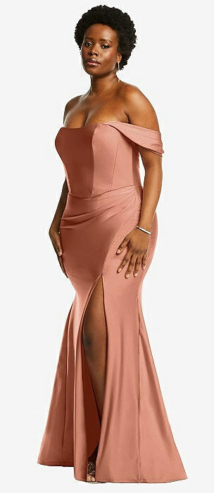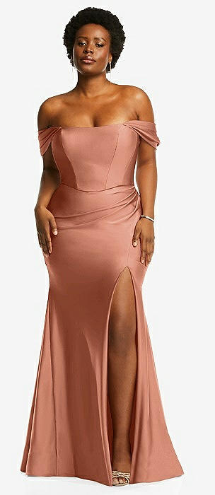 Off-the-Shoulder Corset Stretch Satin Mermaid Dress with Slight Train in copper penny