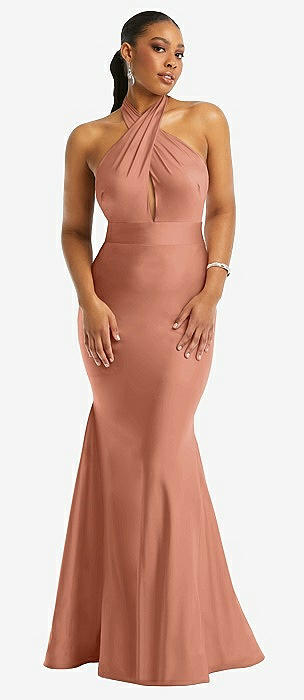 Criss Cross Halter Open-Back Stretch Satin Mermaid Dress in copper penny