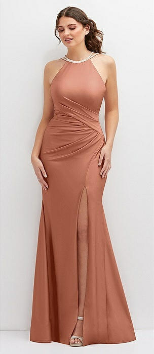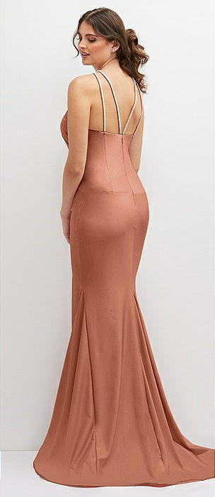 Halter Asymmetrical Draped Stretch Satin Mermaid Dress with Rhinestone Straps in copper penny