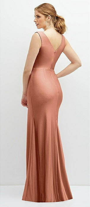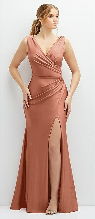 Deep V-Neck Stretch Satin Mermaid Dress with Slight Train in copper penny