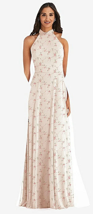 Shirred Skirt Jewel Neck Halter Dress with Front Slit in coquette floral print