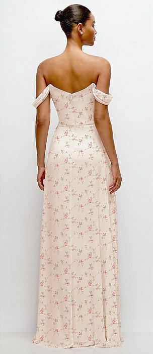Bow-Shoulder V-Back Chiffon Gown with Front Slit in coquette floral print