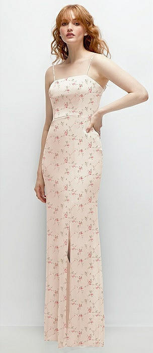 Spaghetti Strap Draped Skirt Gown with Front Slit in coquette floral print