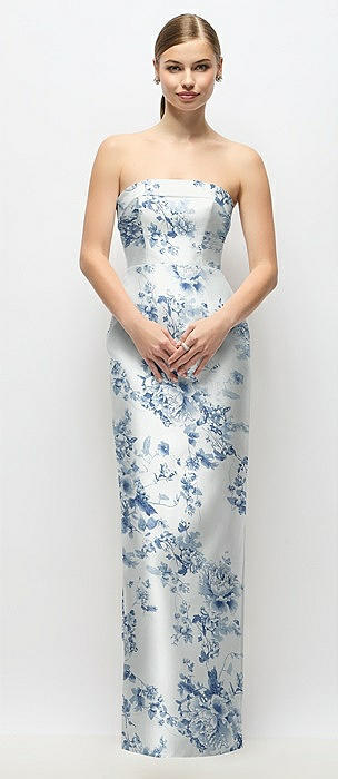 Strapless Floral Satin Column Dress with Back Slit in cottage rose larkspur