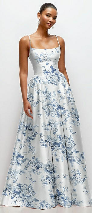 Whether you're looking for all-out romance or something more on the glamorous side, our Cottage Rose Larkspur bridesmaid dresses are the ultimate pick. Its oversized dusty blue blooms and foliage on a white glossy satin twill fabric are reminiscent of a delicate vintage china pattern. Elegant, glamorous and fabulously feminine, these vintage-inspired dusty blue floral gowns are perfect for spring or summer and come in a range of captivating styles.