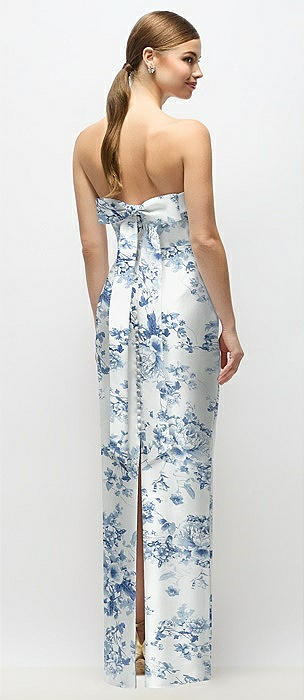 Strapless Floral Satin Column Dress with Back Slit in cottage rose larkspur
