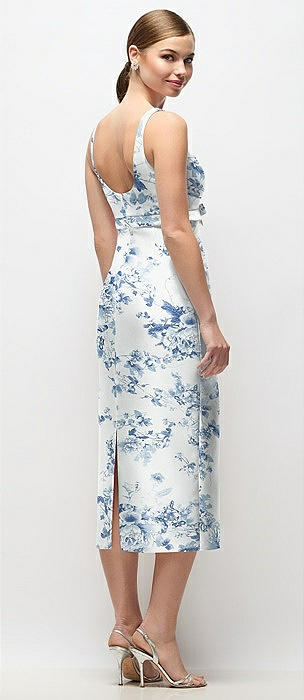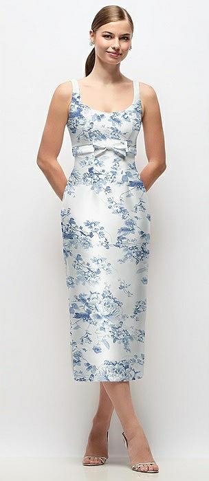 Scoop Neck Floral Satin Column Midi Dress with Bow at Empire Waist in cottage rose larkspur