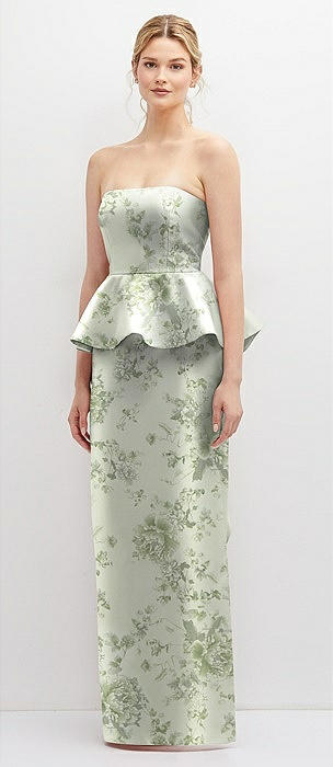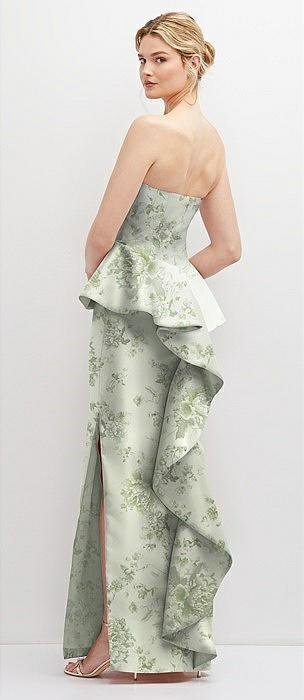 Floral Strapless Satin Maxi Dress with Cascade Ruffle Peplum Detail in sage cottage rose