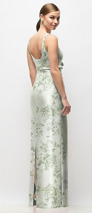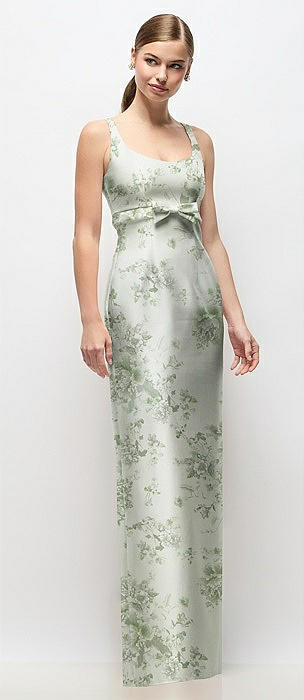 Scoop Neck Floral Satin Column Maxi Dress with Bow at Empire Waist in sage cottage rose