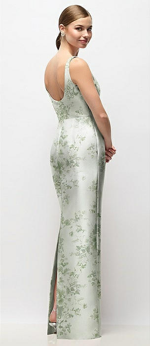 Strapless Floral Satin Column Dress with Back Slit in sage cottage rose
