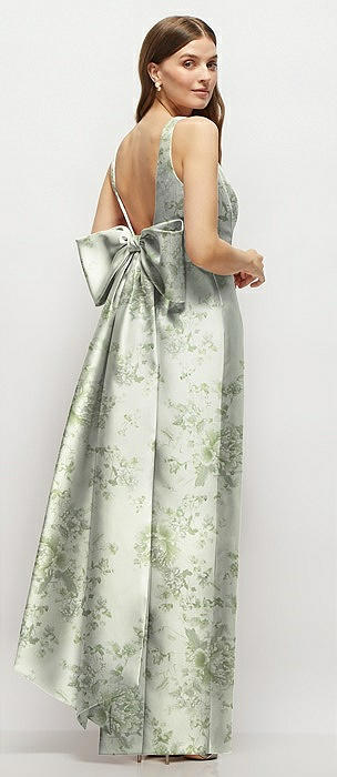 Strapless Floral Satin Column Maxi Dress with Oversized Bow in sage cottage rose