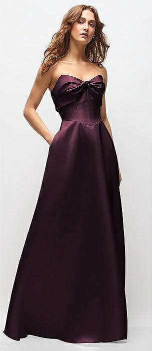Strapless Twist Cuff Neck Satin Maxi Dress with Basque-Waist & Full Skirt in deep plum