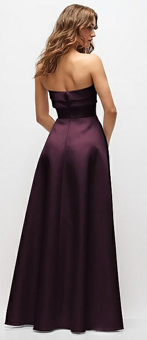 Strapless Draped Bodice Stretch Satin Column Maxi Dress in deep plum