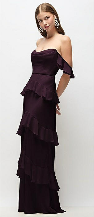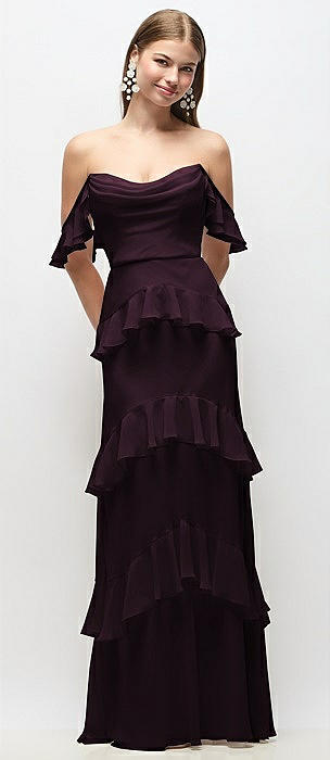 Off-the-Shoulder Cowl Chiffon Tiered Ruffle Maxi Dress with Convertible Ruffle Straps in deep plum