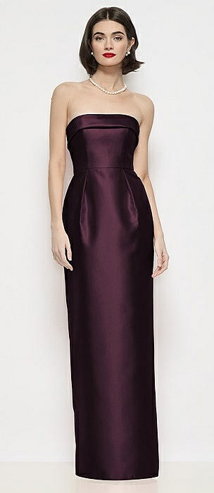 Strapless Pleated U-Wire Satin Column Maxi Dress in deep plum