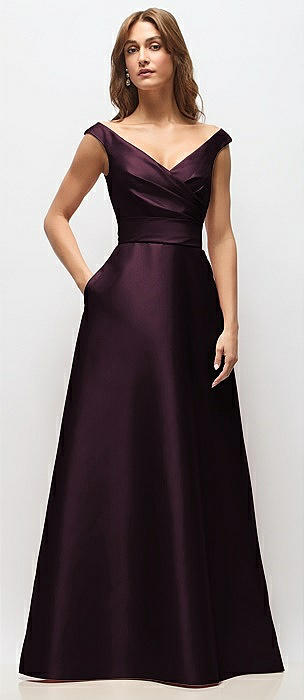 Off-the-Shoulder Draped Wrap Satin Maxi Dress in deep plum