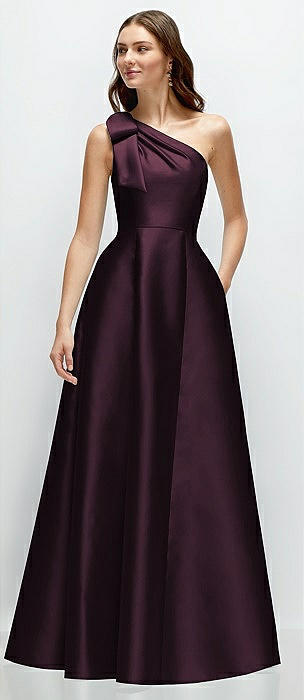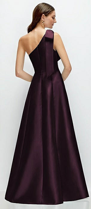 Bow One-Shoulder Full A-Line Satin Maxi Dress in deep plum