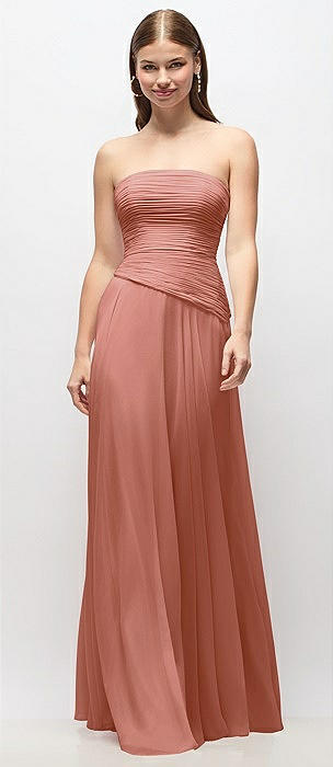 Strapless Chiffon Maxi Dress with Asymmetrical Ruched Drop Waist in desert rose