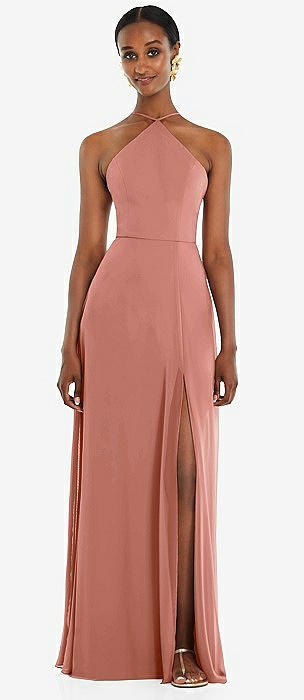 Stand Collar Halter Maxi Dress with Criss Cross Open-Back in desert rose