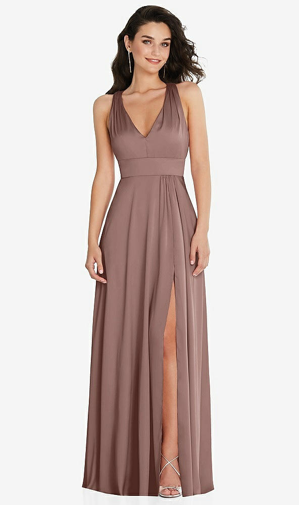 Shirred Shoulder Criss Cross Back Maxi Dress with Front Slit in Sienna