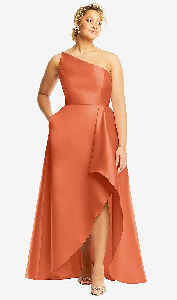 One-Shoulder Satin Gown with Draped Front Slit and Pockets in Portofino Orange