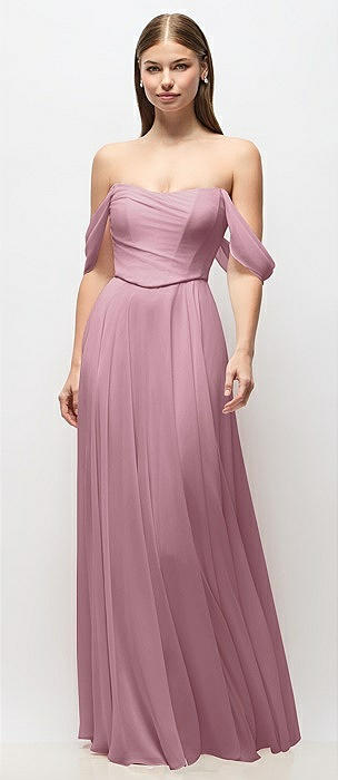 Off-the-Shoulder Basque Corset Chiffon Maxi Dress in dusty pink