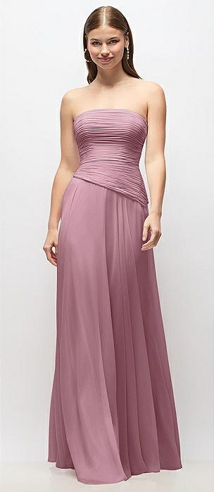 Strapless Chiffon Maxi Dress with Asymmetrical Ruched Drop Waist in dusty pink