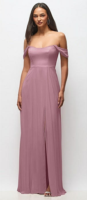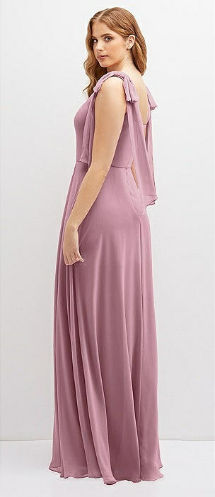 Bow-Shoulder V-Back Chiffon Gown with Front Slit in dusty pink