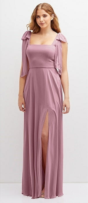 Bow Shoulder Square Neck Chiffon Maxi Dress in dusty pink