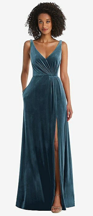 Draped Skirt Faux Wrap Velvet Maxi Dress in dutch blue