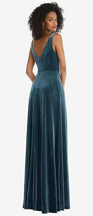 High-Neck Cap Shoulder Pleated Bodice Velvet Column Maxi Dress in dutch blue