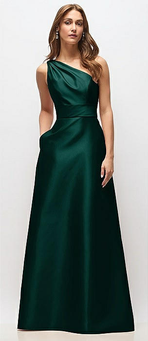 Draped One-Shoulder Satin Maxi Dress with Pockets in evergreen