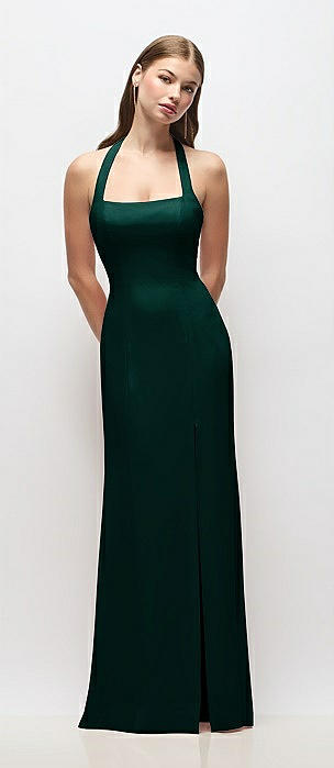 High-Neck Halter Open-Back Satin Trumpet Dress in evergreen