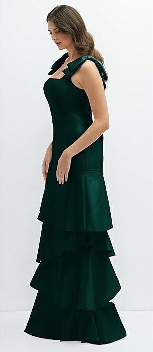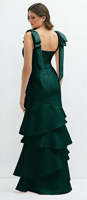 Bow-Shoulder Satin Maxi Dress with Asymmetrical Tiered Skirt in evergreen
