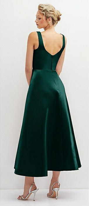 Square Neck Satin Midi Dress with Full Skirt & Pockets in evergreen